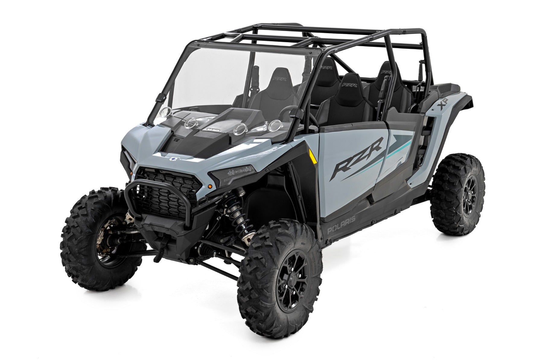 Added Protection and Customizable Comfort: Shield the occupants of your Polaris RZR XP4 1000 from off-road hazards like rocks, branches, and debris with Rough Country's Scratch-Resistant Windshield. This innovative design combines protection with unmatched comfort by featuring 4 adjustable vents that allow you to control airflow to suit your needs. Vents can be closed, opened, or half-opened for ultimate versatility. Whether you're navigating dusty trails or keeping cool on hot days, the 360 degree rotating vents provide superior flexibility, making every ride more enjoyable. High-Quality Polycarbonate Construction: Crafted from thick .25 polycarbonate material, Rough Country windshields deliver the ultimate combination of clarity, flexibility, and durability. Precision cut for a flawless fit, this material outperforms glass and acrylic in toughness, ensuring your windshield can handle even the roughest terrains. Enhanced Durability with Scratch and UV Resistance: Each windshield is coated with a secondary AR2 hard-coating process, creating a robust scratch-resistant barrier that extends its lifespan. This treatment also provides UV protection, ensuring your windshield remains clear and functional for years to come. Contoured Design with a Precision Fit: The contoured design and premium rubber seal ensure a secure, rattle-free fit that keeps out dust, debris, and water, while seamlessly complementing the rugged aesthetics of your Polaris RZR XP4 1000. Seamless Roof Compatibility: Engineered to integrate effortlessly with both factory and most aftermarket roofs, this windshield adds versatility without compromising style or functionality. Quick and Easy Installation: With a simple strap-on installation process, you can have your Rough Country windshield ready to go in as little as 15-30 minutes. Spend less time prepping and more time conquering the trails. Limited-Lifetime Replacement Warranty: Rough Country stands behind its products with a limited lifetime replacement warranty against manufacturer defects. Ride with confidence knowing your windshield is protected from structural or workmanship damage.